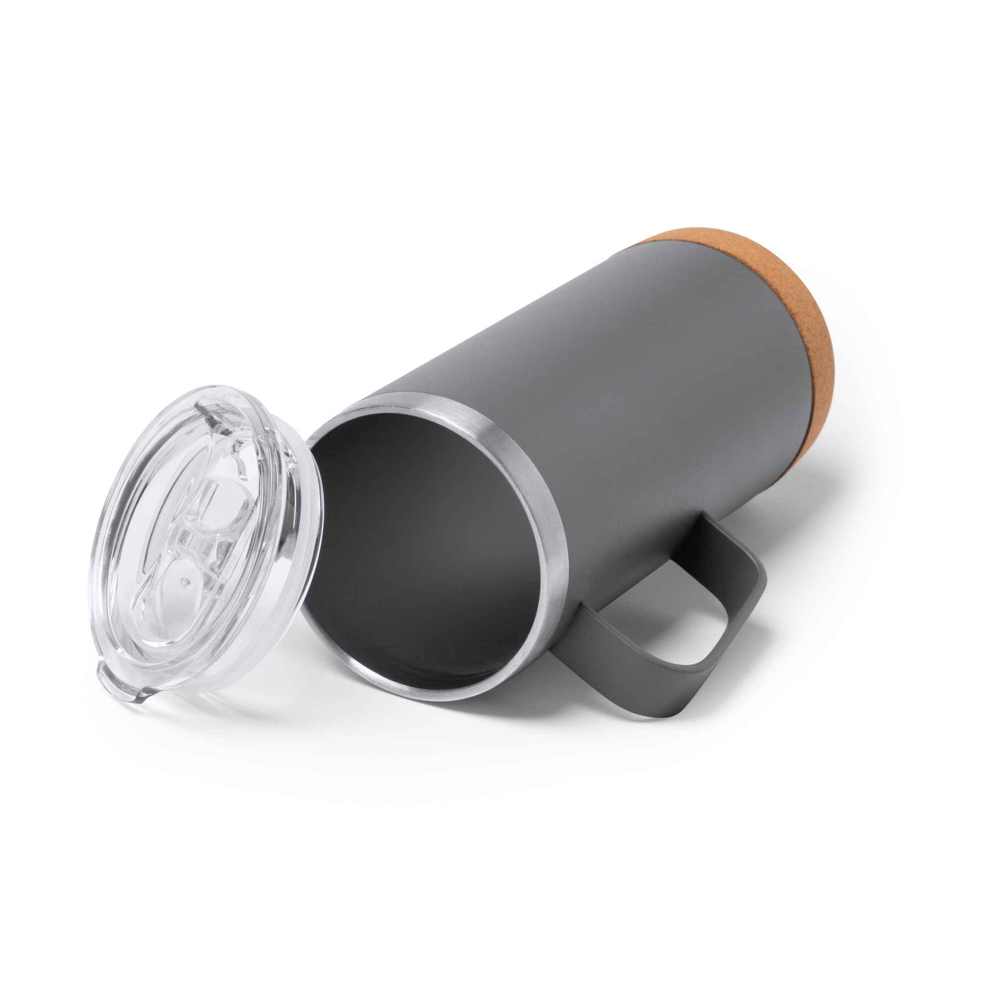 TAZA: Taza de acero inoxidable reciclado de doble pared. Con base de corcho, evitando