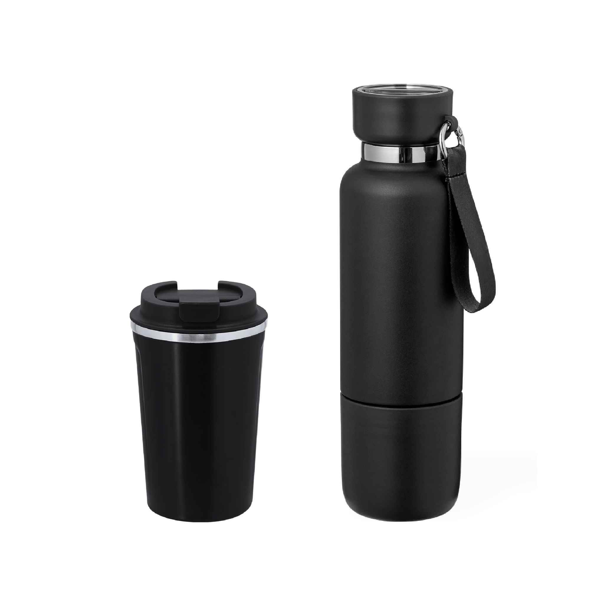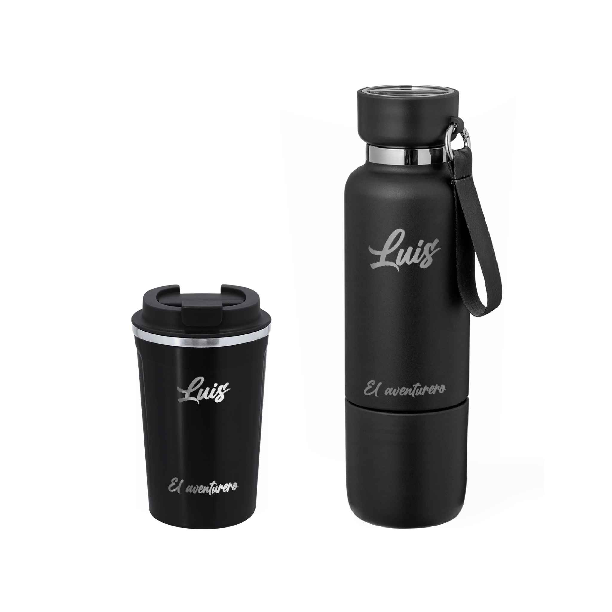 Un pack pensado para los que siempre tienen un plan (o dos). Este dúo incluye un termo de 500 ml y un vaso de 300 ml, ambos personalizables con nombre o mensaje, para que no se pierdan ni en la oficina ni en una excursión.