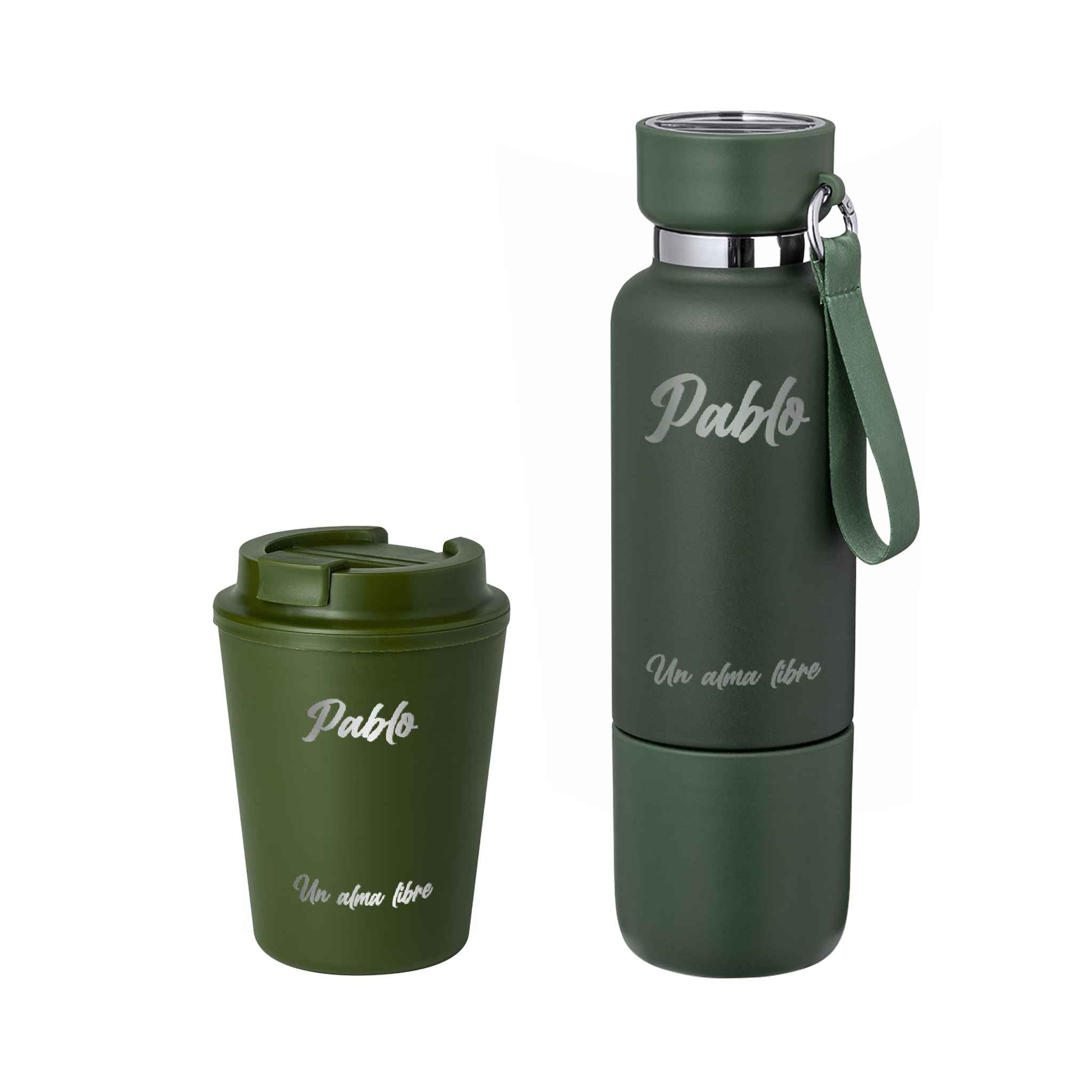 Un pack pensado para los que siempre tienen un plan (o dos). Este dúo incluye un termo de 500 ml y un vaso de 350 ml, ambos personalizables con nombre o mensaje, para que no se pierdan ni en la oficina ni en una excursión.